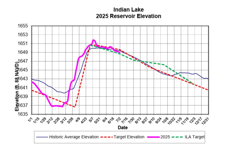 Below is a graph from the Hudson River Black River Regulating District that shows the actual Indian Lake water levels as of mid August, 2025 (purple line), as well as the Historic Average (black line), target elevations (red dashed line), and the elevation agreed on between the Indian Lake Association and HRBRRD for the lake (green dashed line).   The combination of the large drainage area and the relatively small outlets on the dam mean that a large rain event or rapid snow melt can make the lake rise significantly even with the gates fully open.